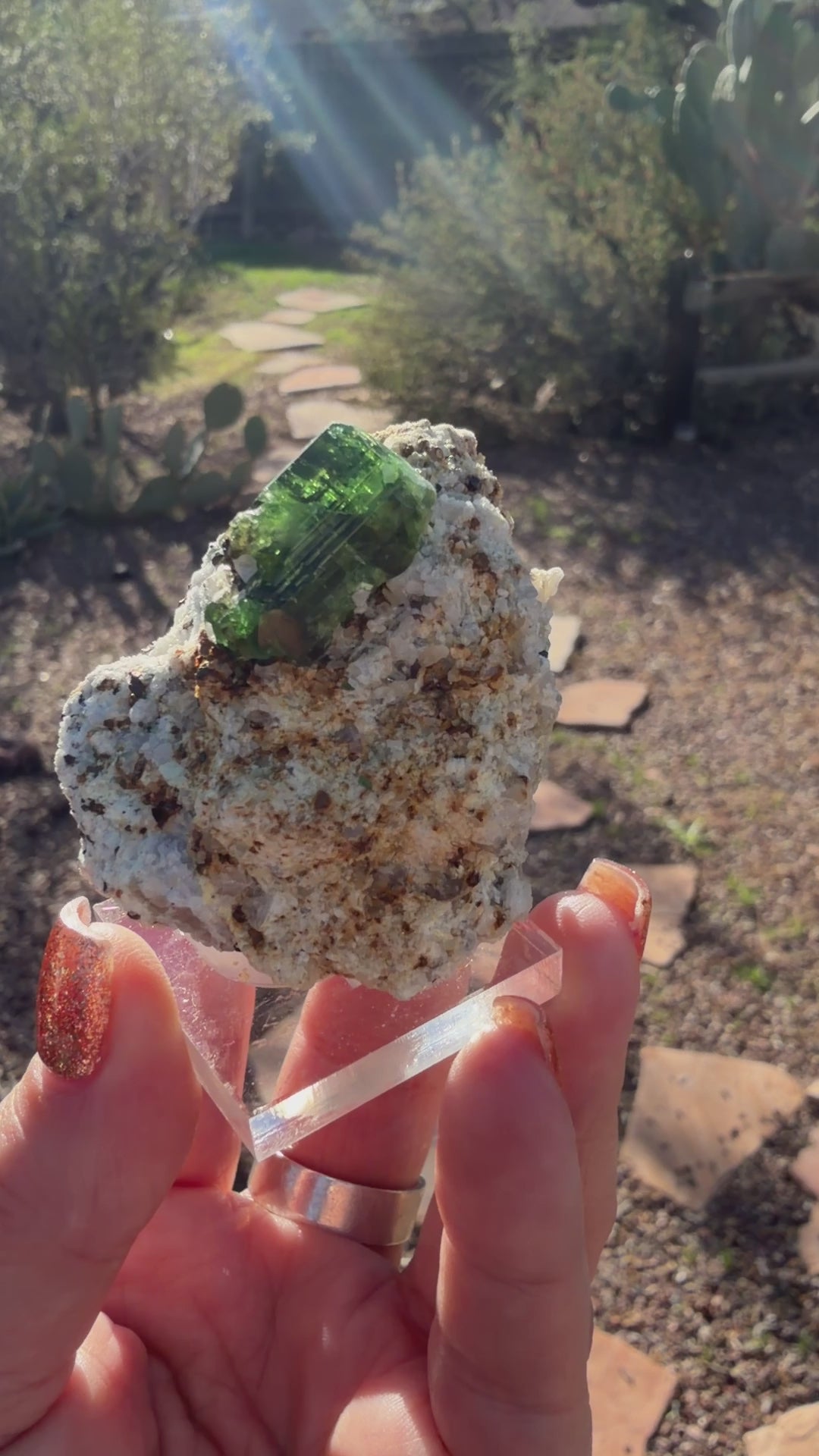 Vanadium dravite tourmaline in matrix from Tanzania. Rich green gem atop its host rock! This is a vibrant mineral specimen great for any collection stage ✨ Crystal is just under an inch in size with entire specimen @ approx 2.25”